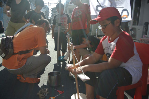 盛り上がっていたのは火起こし体験ブース。炎天下のなか、火をおこそうと子どもたちは一生懸命でした!