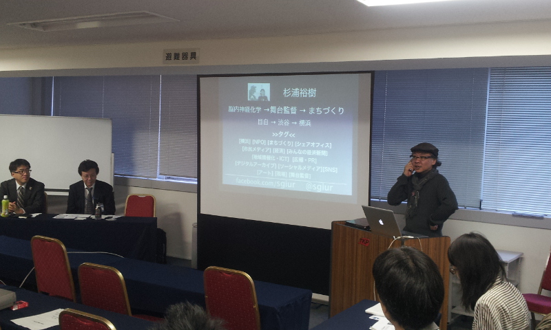 杉浦は、横浜コミュニティデザイン・ラボの活動や横浜の地域情報化の現在の動きを紹介。「ヨコハマ経済新聞」や「かなマグ.net」などのWEBメディアを通じた情報発信の事業や、横浜市経済局と展開している「ソーシャルビジネス普及事業」、市内のコワーキングスペースの状況や、商店会や自治会などの地縁のコミュニティや行政のコミュニティなど地域の異なるセクターを結びつけるエリアマネジメントの取り組み事例などを紹介。今年度からはじめた「政策デザイン勉強会」についても話をしました。